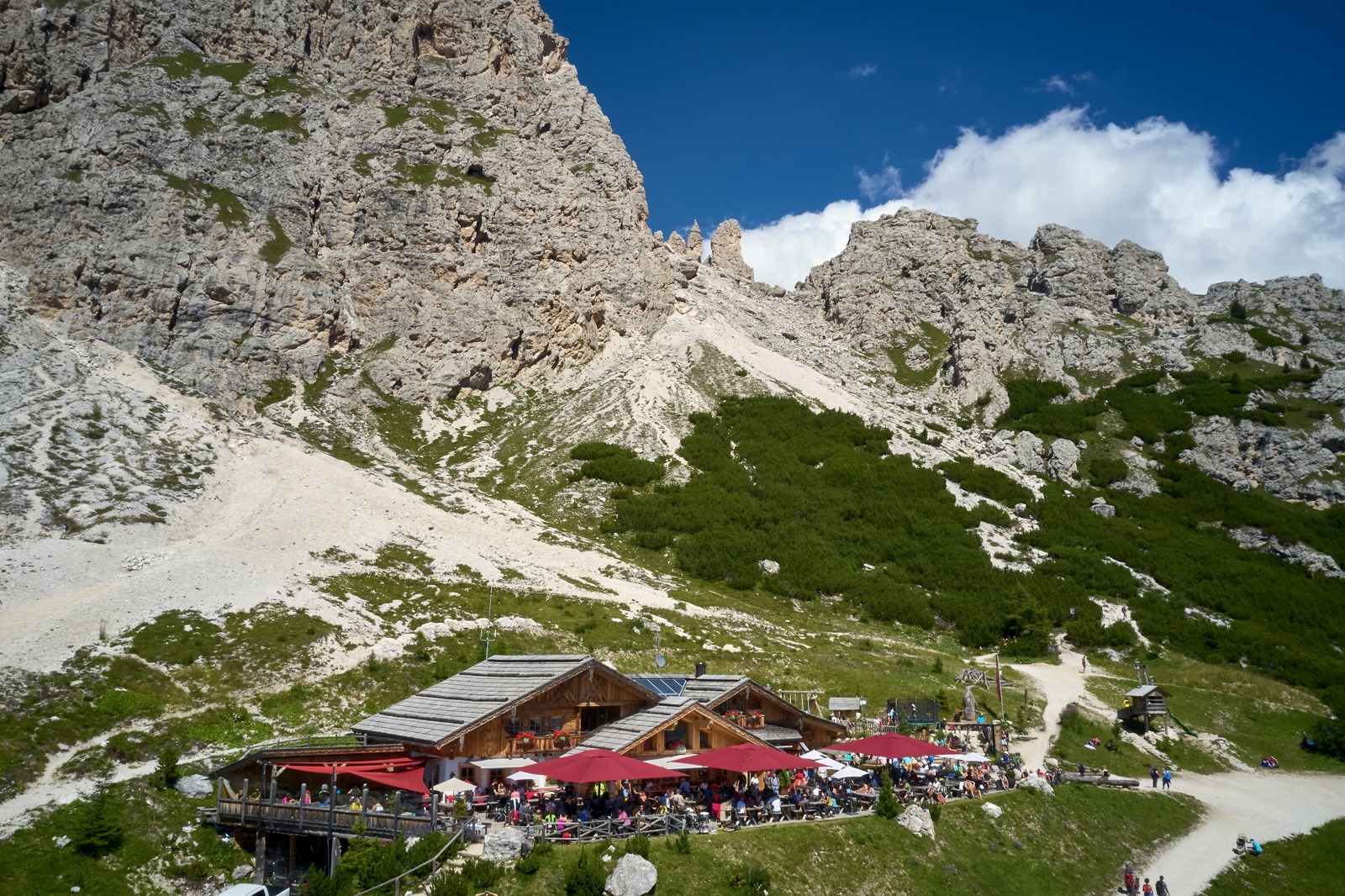 The sun also shines on the Gardena Pass, both in summer and winter, which is why we supplied beautiful, sturdy umbrellas in the signal colour red that can withstand any weather.