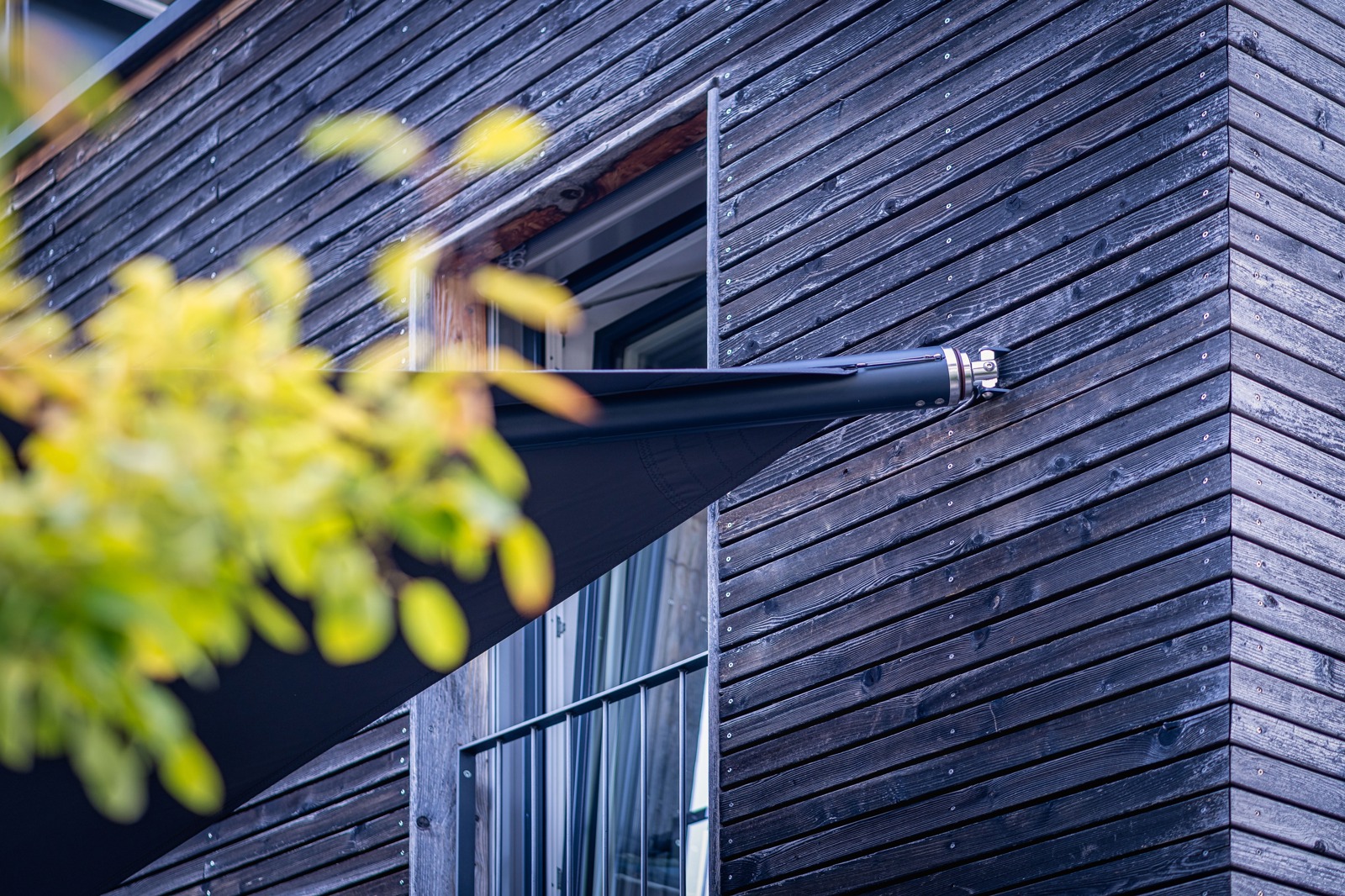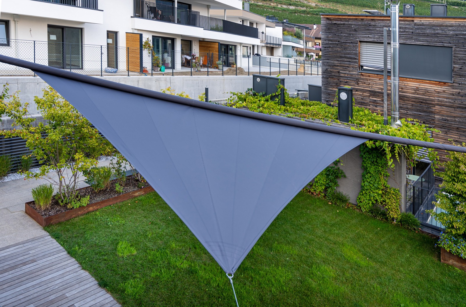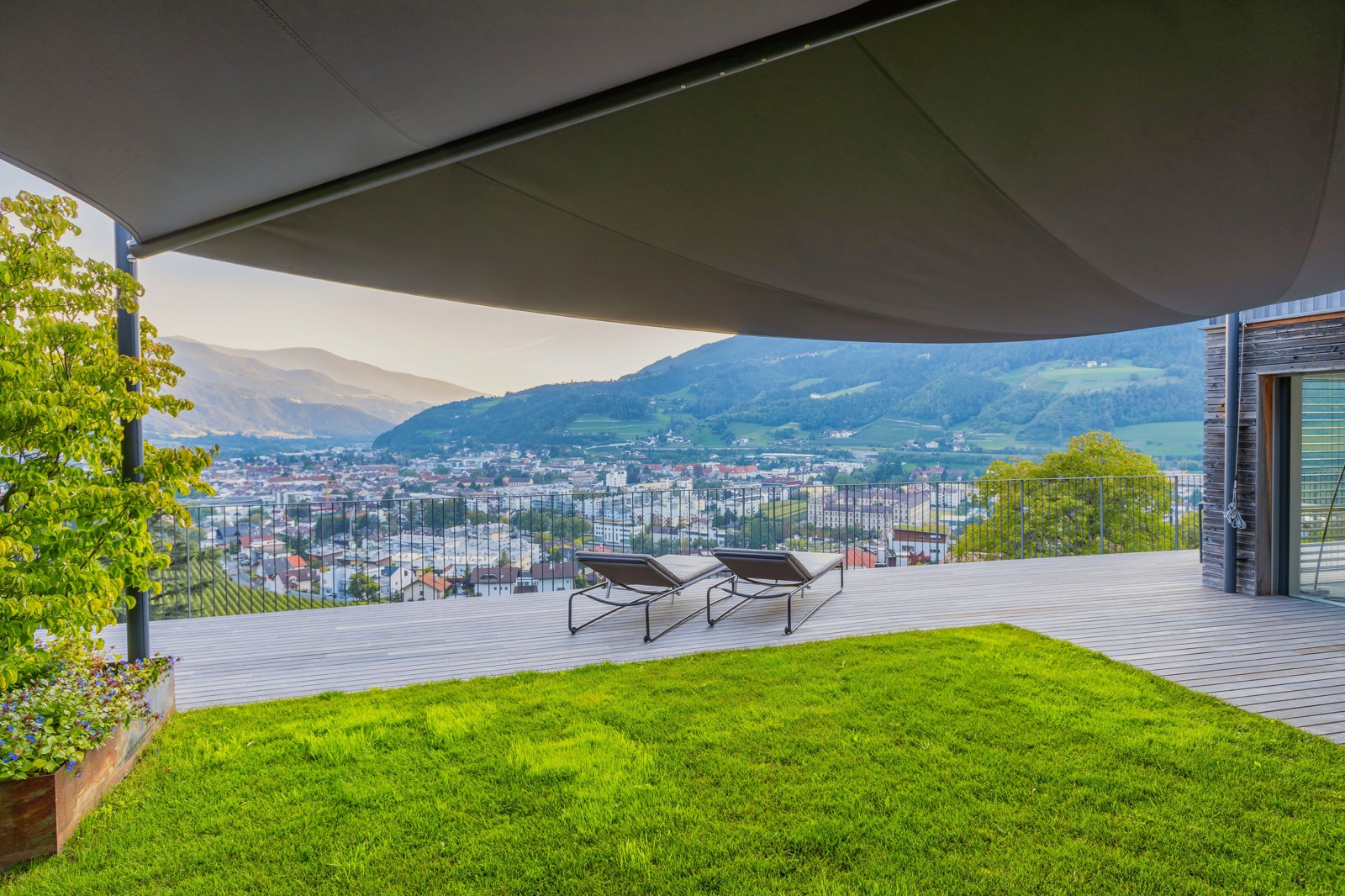 Villa con tenda da sole Bressanone/Alto Adige (I) Le nostre prestazioni: Progettazione e installazione di una vela come protezione dal sole e dalla pioggia per la terrazza privata Panoramica delle referenze