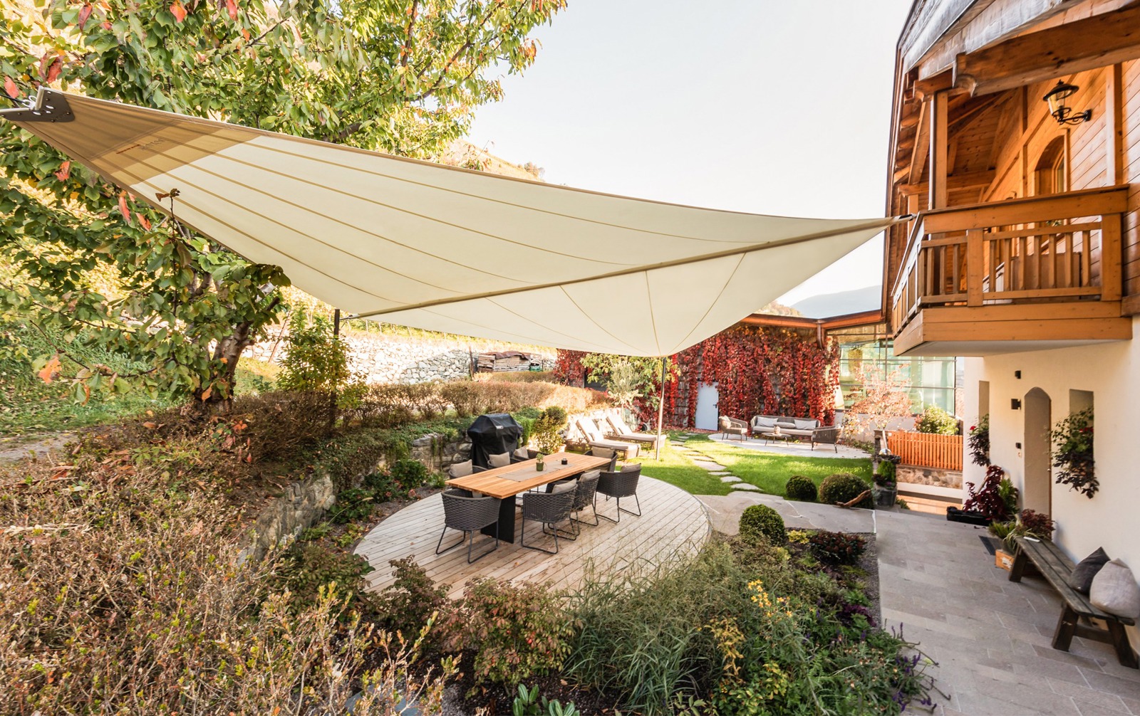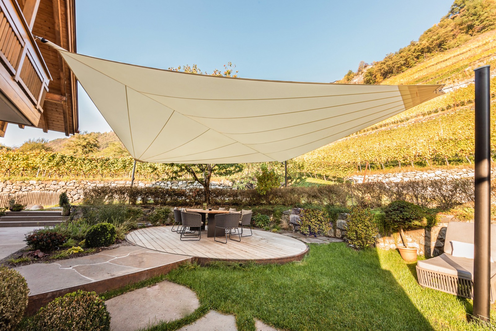 Weingut Taschlerhof Brixen/Südtirol (I) Unsere Leistungen: Planung & Installation eines Sonnensegles zur Beschattung der Terrasse Übersicht Referenzen